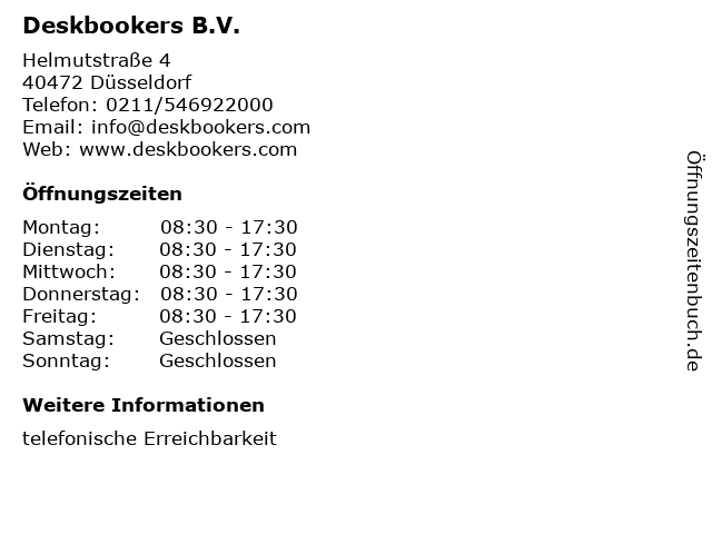 | Öffnungszeiten Deskbookers B.V. in Düsseldorf anzeigen | |