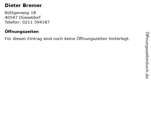 | Öffnungszeiten Dieter Bremer in Düsseldorf anzeigen | |