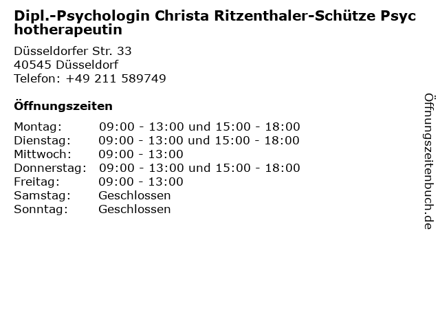 1 Diplom Psychologin Ch. Frank-Slawik Psychotherapeutische Praxis (Entfernung: 0,39 km) Cheruskerstr. 56a, 40545 Düsseldorf 2 Christa Steinberg Architektin, Wolfgang Gandre (Entfernung: 0,65 km) Brend'amourstr. 2, 40545 Düsseldorf 4 Christa Ritzenthaler-Schütze Psychoterapeutin (Entfernung: 1,09 km) Hohenstaufenstr. 4, 40547 Düsseldorf 5 Christa Stüttgen Fleisch-, Wild- u. Geflügelspezialitäten (Entfernung: 1,44 km) Carlsplatz B5, 40213 Düsseldorf 6 |