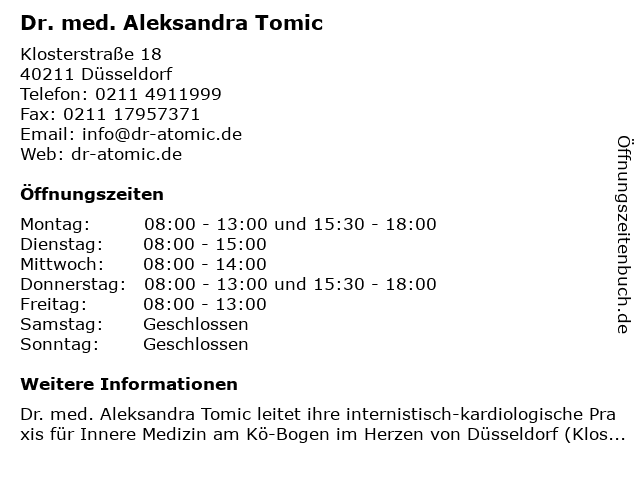 | Öffnungszeiten Dr. med. Aleksandra Tomic in Düsseldorf anzeigen | |