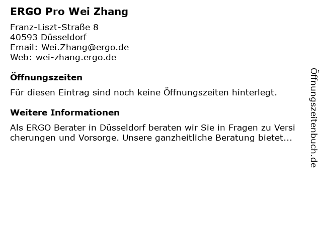 | Öffnungszeiten ERGO Pro Wei Zhang in Düsseldorf anzeigen | |