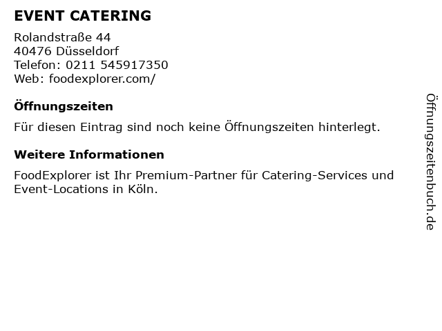 | Öffnungszeiten EVENT CATERING in Düsseldorf anzeigen | |