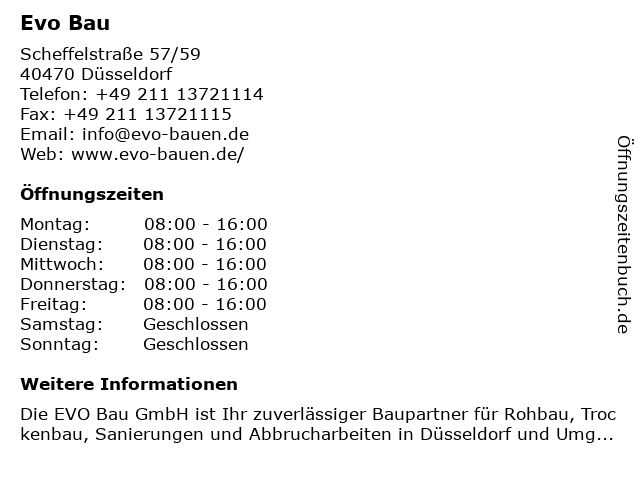 | Öffnungszeiten Evo Bau in Düsseldorf anzeigen | |