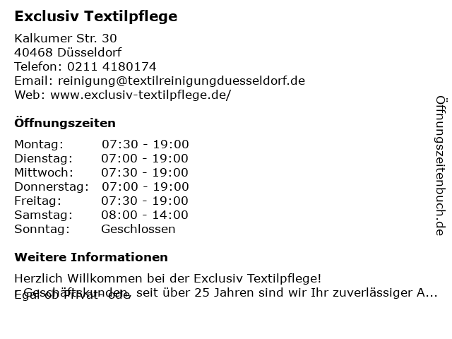 | Öffnungszeiten Exclusiv Textilpflege in Düsseldorf anzeigen | |
