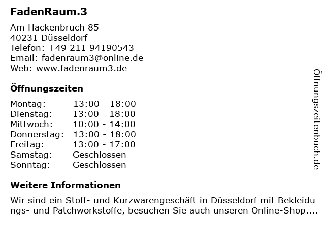 | Öffnungszeiten FadenRaum.3 in Düsseldorf anzeigen | |