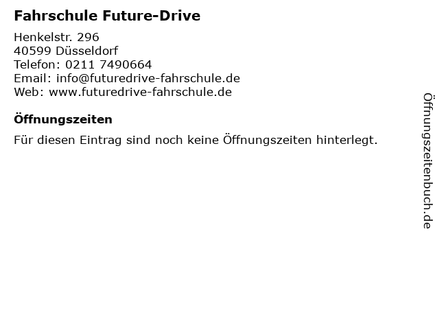 | Öffnungszeiten Fahrschule Future-Drive in Düsseldorf anzeigen | |