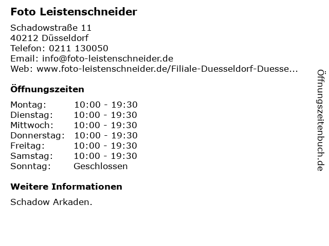 | Öffnungszeiten Foto Leistenschneider in Düsseldorf anzeigen | |