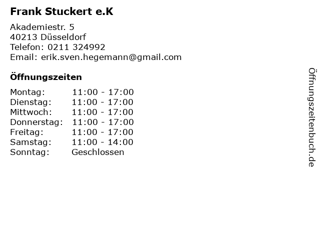 | Öffnungszeiten Frank Stuckert e.K in Düsseldorf anzeigen | |