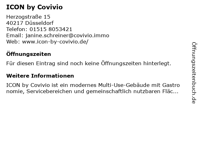 | Öffnungszeiten ICON by Covivio in Düsseldorf anzeigen | |