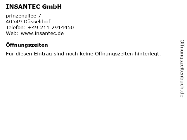 | Öffnungszeiten INSANTEC GmbH in Düsseldorf anzeigen | |