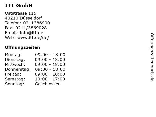 | Öffnungszeiten ITT GmbH in Düsseldorf anzeigen | |