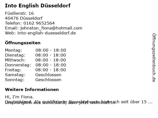 | Telefonnummer Into English Düsseldorf in Düsseldorf (0162 9652564) anrufen | |