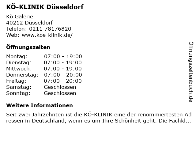 | Öffnungszeiten KÖ-KLINIK Düsseldorf in Düsseldorf anzeigen | |