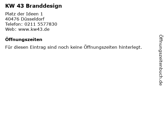 | Öffnungszeiten KW 43 Branddesign in Düsseldorf anzeigen | |