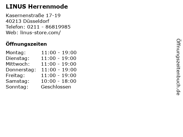 | Öffnungszeiten LINUS Herrenmode in Düsseldorf anzeigen | |