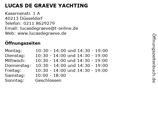 | Öffnungszeiten LUCAS DE GRAEVE YACHTING in Düsseldorf anzeigen | |