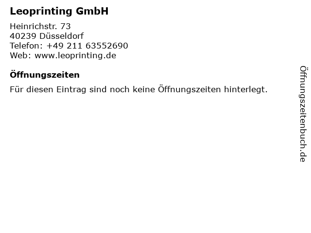 | Öffnungszeiten Leoprinting GmbH in Düsseldorf anzeigen | |