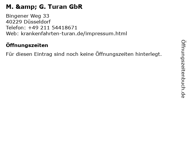 | Öffnungszeiten M. & G. Turan GbR in Düsseldorf anzeigen | |