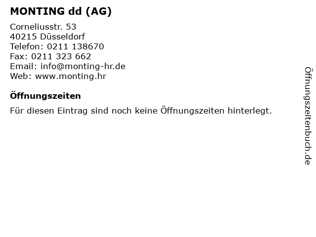 | Öffnungszeiten MONTING dd (AG) in Düsseldorf anzeigen | |