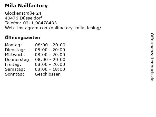| Öffnungszeiten Mila Nailfactory in Düsseldorf anzeigen | |