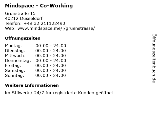 | Öffnungszeiten Mindspace - Co-Working in Düsseldorf anzeigen | |