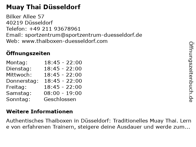 | Öffnungszeiten Muay Thai Düsseldorf in Düsseldorf anzeigen | |