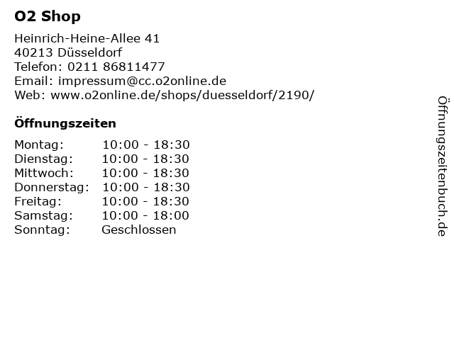 | Öffnungszeiten O2 Shop in Düsseldorf anzeigen | |