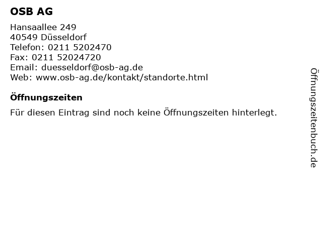 | Öffnungszeiten OSB AG in Düsseldorf anzeigen | |
