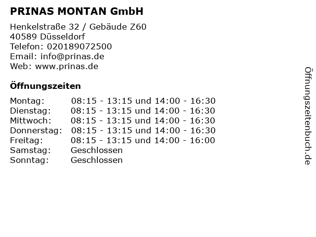 | Öffnungszeiten PRINAS MONTAN GmbH in Düsseldorf anzeigen | |
