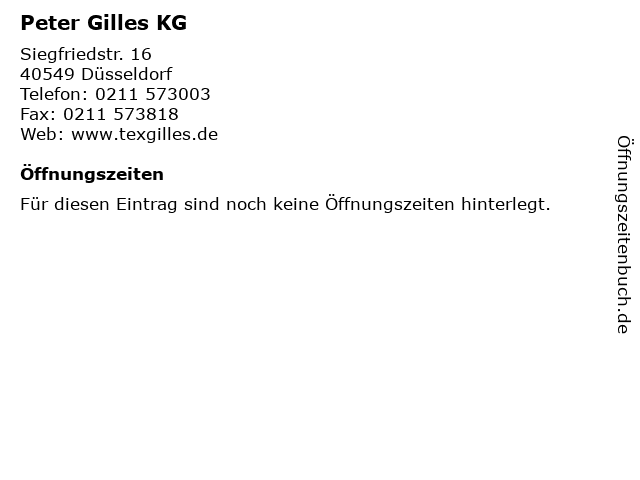 | Öffnungszeiten Peter Gilles KG in Düsseldorf anzeigen | |