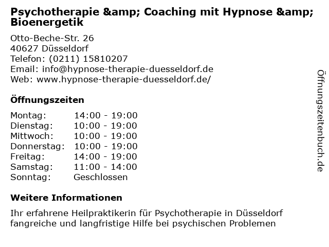 1 Psychotherapie & Coaching mit Hypnose & Bioenergetik (Entfernung: 0,00 km) Otto-Beche-Straße 26, 40627 Düsseldorf 2 Wuddel Ingo Dr. Integrales Coaching und Organisationsberatung Unternehmensberatung (Entfernung: 4,22 km) Ritastr. 5, 40589 Düsseldorf 3 Ute Gutgesell Personalberatung und Coaching GmbH (Entfernung: 4,79 km) Grafenberger Allee 76, 40237 Düsseldorf 4 Margot Abstiens Unternehmensberaterin Coaching (Entfernung: 5,90 km) Nikolaus-Otto-Str. 1, 40721 Hilden 5 Tiefenpsychologisch fundierte Körperpsychotherapie Coaching und Supervision (Entfernung: 7,04 km) Volmerswerther Str. 325, 40221 Düsseldorf 6 |