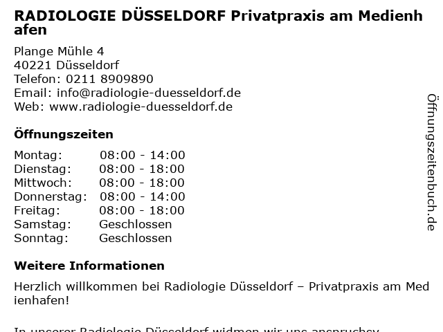 1 Radiologie Düsseldorf - Privatpraxis am Medienhafen (Entfernung: 0,01 km) Plange Mühle 4, 40221 Düsseldorf 5 Zahnarztpraxis Dr. Laja & Kollegen im Medienhafen (Entfernung: 0,69 km) Neuer Zollhof 1, 40221 Düsseldorf 6 Plastische Chirurgie im Medienhafen, Dr. A. Arens-Landwehr, Dr. J. Diedrichson, Dr. T. Scholz (Entfernung: 0,74 km) Neuer Zollhof 2, 40221 Düsseldorf |