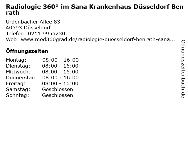1 Radiologie 360° im Sana Krankenhaus Düsseldorf Benrath (Privatsprechstunden) (Entfernung: 0,00 km) Urdenbacher Allee 83, 40593 Düsseldorf 3 Sana Krankenhaus Benrath - Besuchszeiten (Entfernung: 0,01 km) Urdenbacher Allee 83, 40593 Düsseldorf 6 |