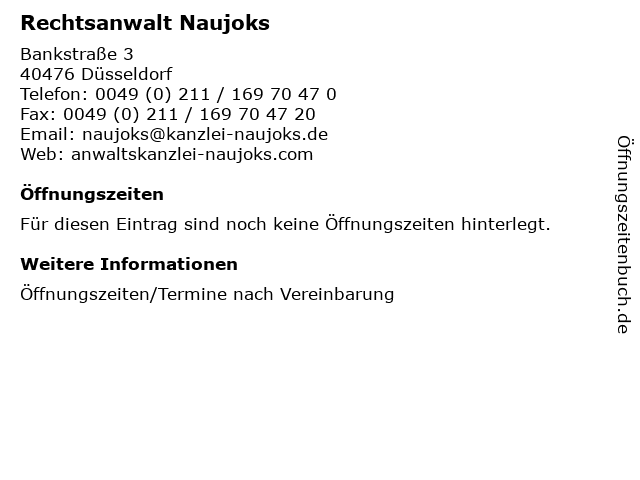 | Öffnungszeiten Rechtsanwalt Naujoks in Düsseldorf anzeigen | |