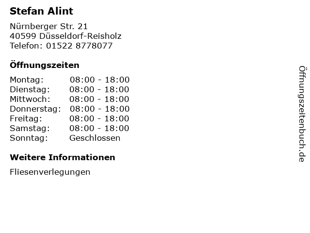 | Öffnungszeiten Stefan Alint in Düsseldorf-Reisholz anzeigen | |