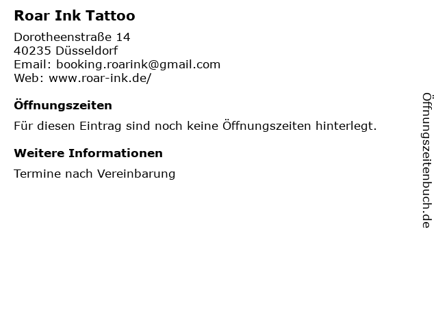 | Öffnungszeiten Roar Ink Tattoo in Düsseldorf anzeigen | |