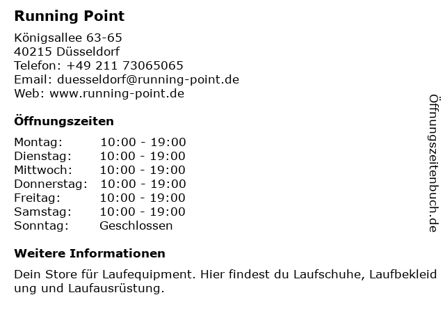| Öffnungszeiten Running Point in Düsseldorf anzeigen | |