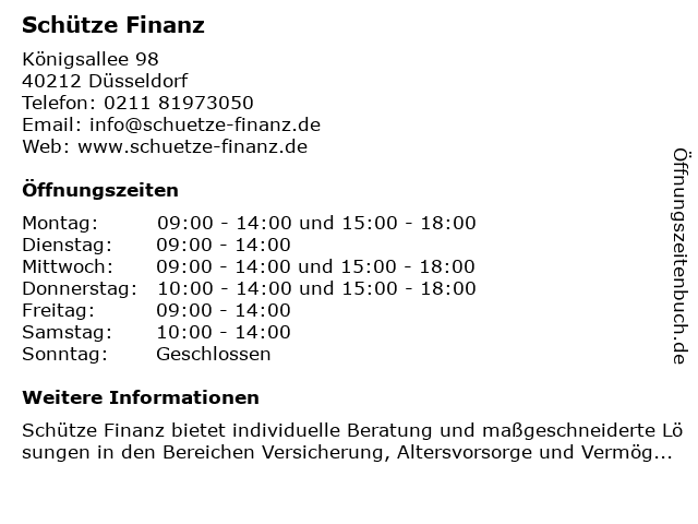| Öffnungszeiten Schütze Finanz in Düsseldorf anzeigen | |