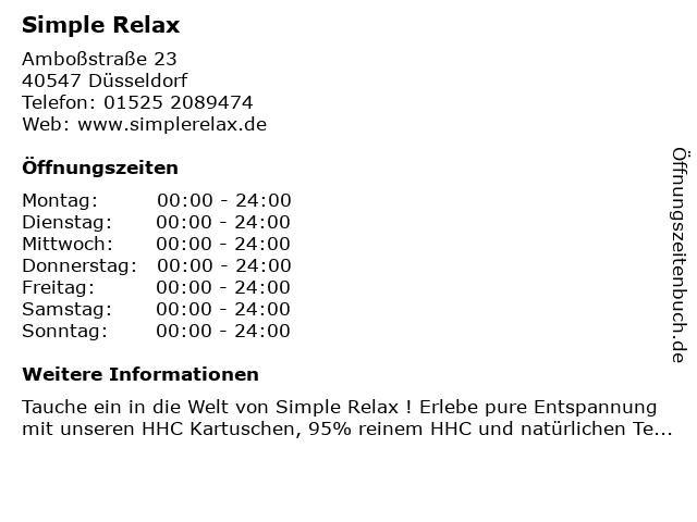 | Öffnungszeiten Simple Relax in Düsseldorf anzeigen | |