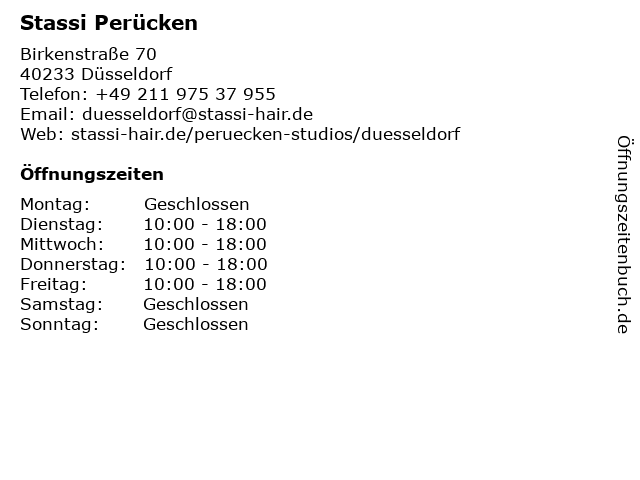 | Öffnungszeiten Stassi Perücken in Düsseldorf anzeigen | |