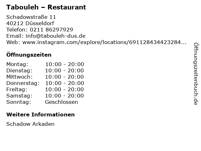 | Öffnungszeiten Tabouleh – Restaurant in Düsseldorf anzeigen | |
