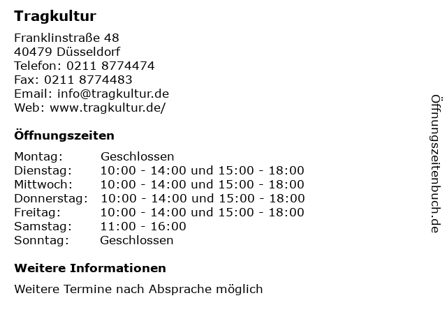 | Öffnungszeiten Tragkultur in Düsseldorf anzeigen | |