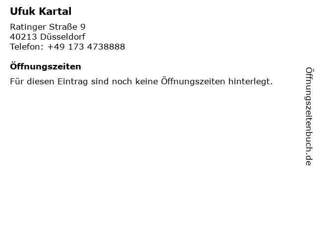 | Öffnungszeiten Ufuk Kartal in Düsseldorf anzeigen | |
