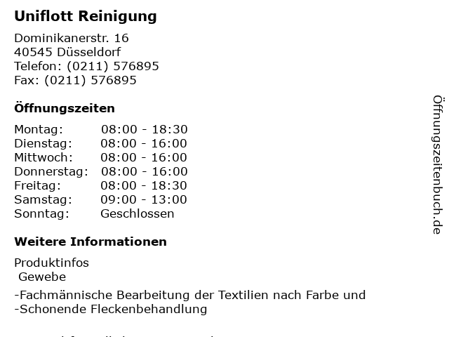 | Öffnungszeiten Uniflott Reinigung in Düsseldorf anzeigen | |