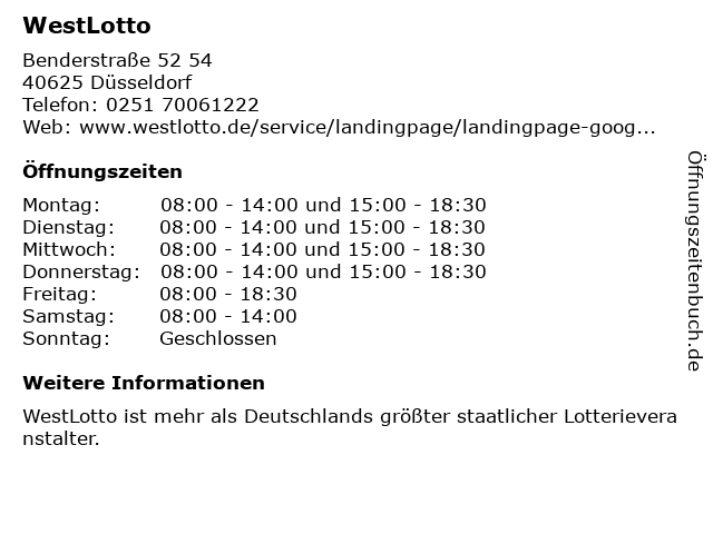 | Öffnungszeiten WestLotto in Düsseldorf anzeigen | |