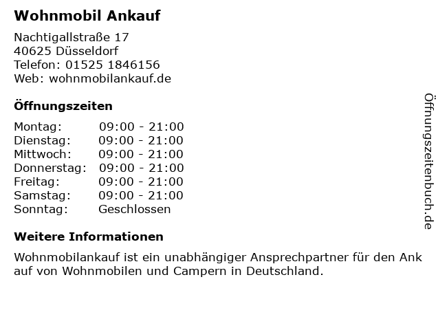 | Öffnungszeiten Wohnmobil Ankauf in Düsseldorf anzeigen | |