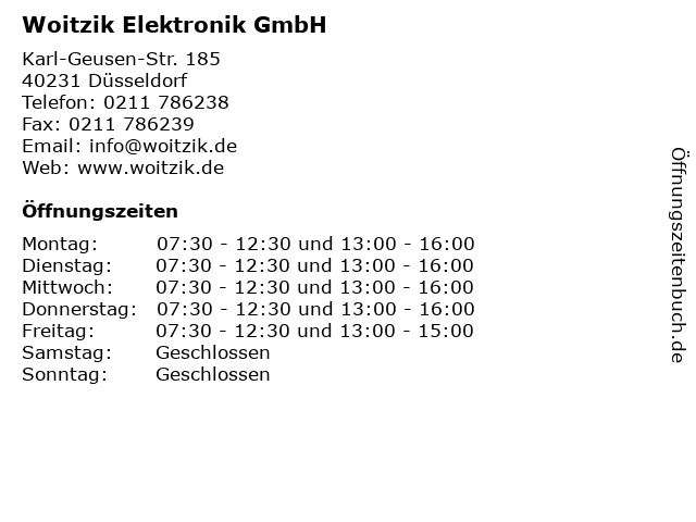 | Öffnungszeiten Woitzik Elektronik GmbH in Düsseldorf anzeigen | |