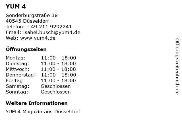 | Öffnungszeiten YUM 4 in Düsseldorf anzeigen | |