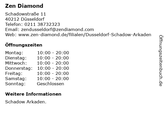 | Öffnungszeiten Zen Diamond in Düsseldorf anzeigen | |