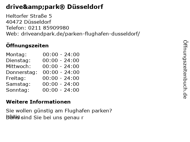 | Öffnungszeiten drive&park® Düsseldorf in Düsseldorf anzeigen | |